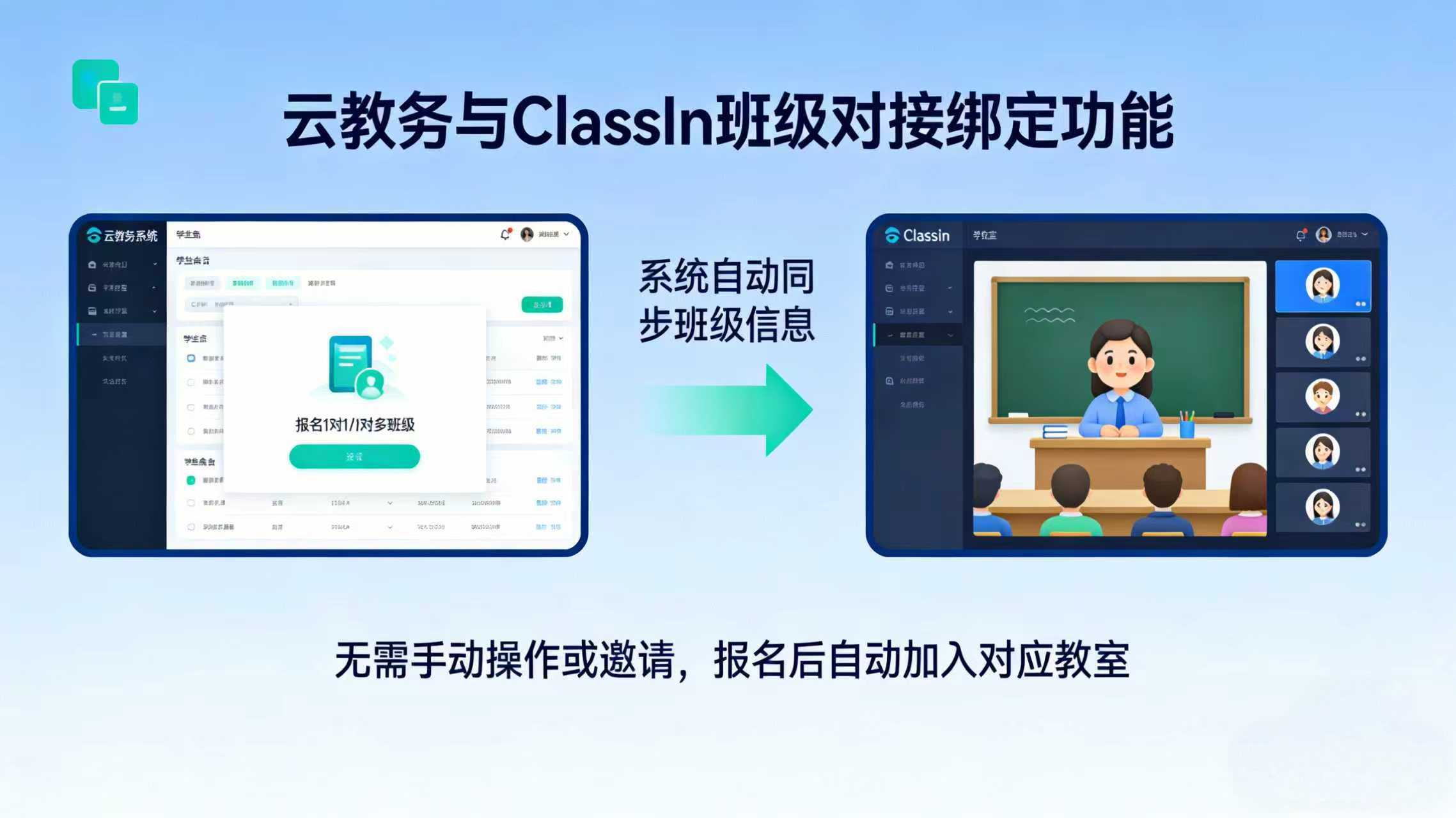 云教务与classin班级关系绑定对接:学生报名班级自动被加入到ClassIn对应的教室中,无需手动操作或邀请