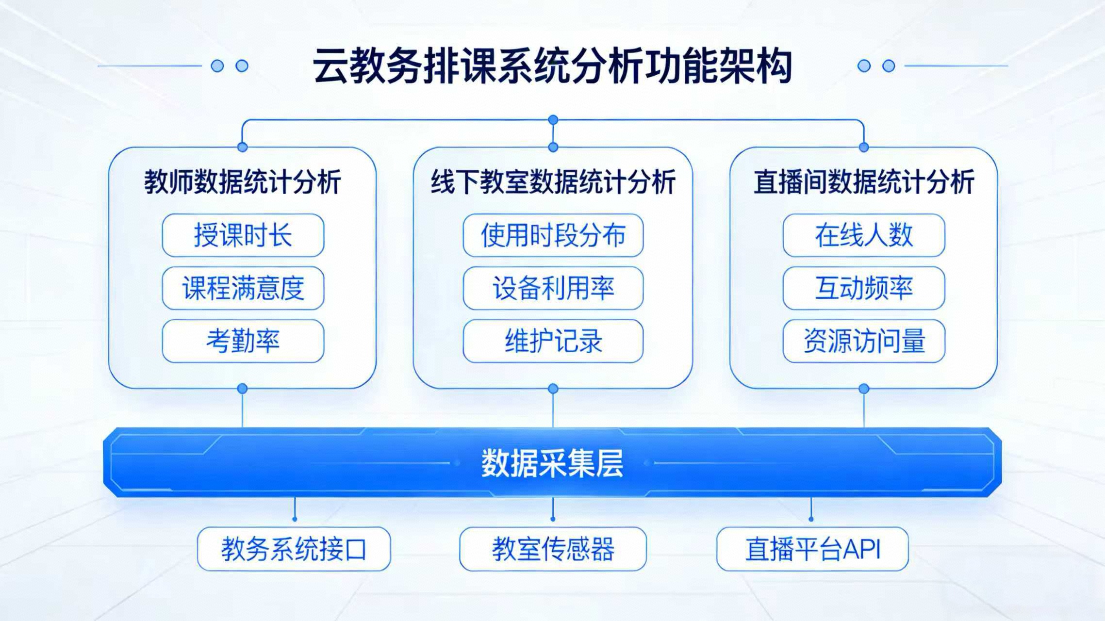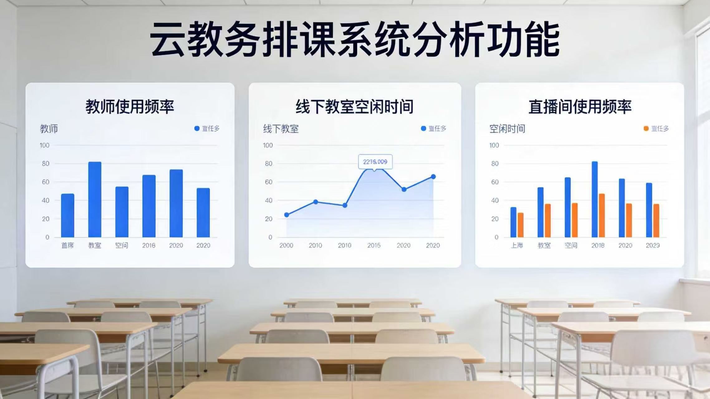 该个性化方案中的分析功能,全程围绕教师、线下教室、直播间的使用核心需求设计,通过精准的统计分析,为排课工作提供可靠依据,帮助老师减少排课调整次数,提升教务工作效率,贴合学校日常教务工作的实际场景。
