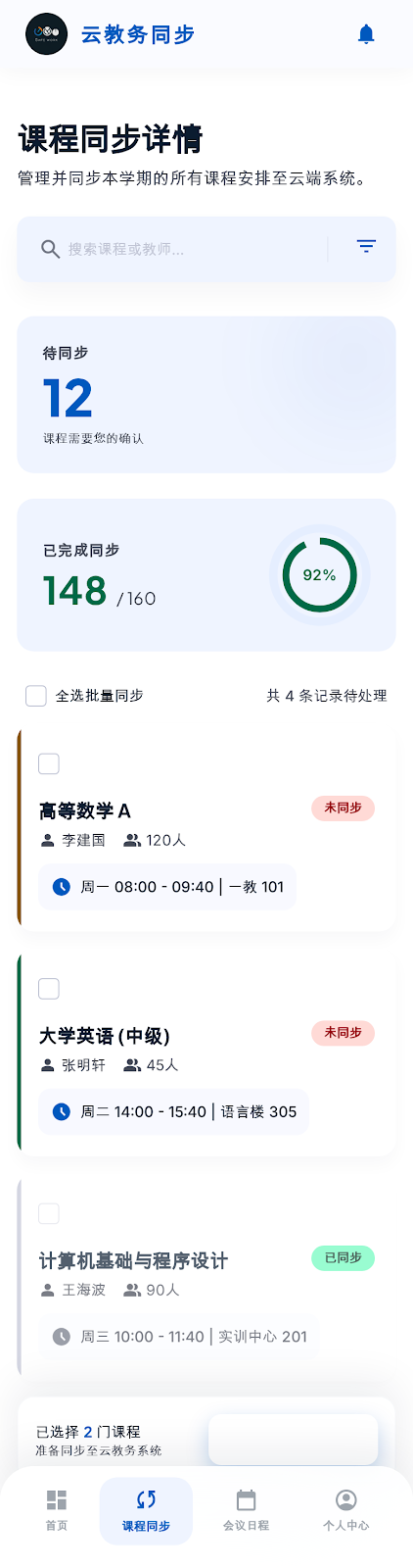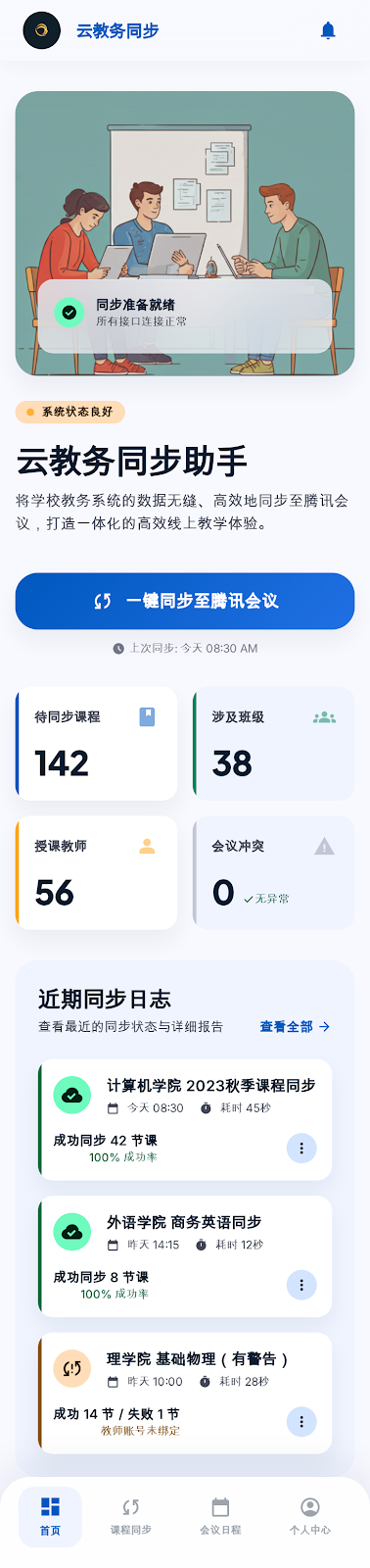 (1)课程表自动同步:云教务内的课程表信息可一键批量同步至腾讯会议,同步内容涵盖完整上课时间,无需老师手动在腾讯会议内逐一录入课程时间,确保两端课程表信息完全一致,减少重复操作。