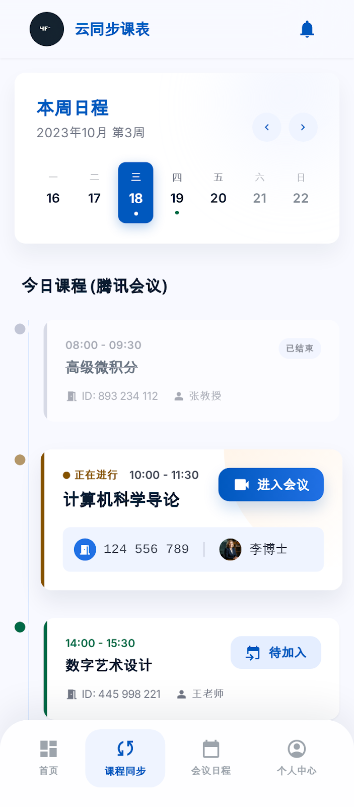 (3)一键批量创建会议:触发同步操作后,将根据云教务内的课程相关信息,在腾讯会议自动批量创建对应课堂会议,每个课程对应专属会议,无需老师单独创建,同步完成后即可投入使用。