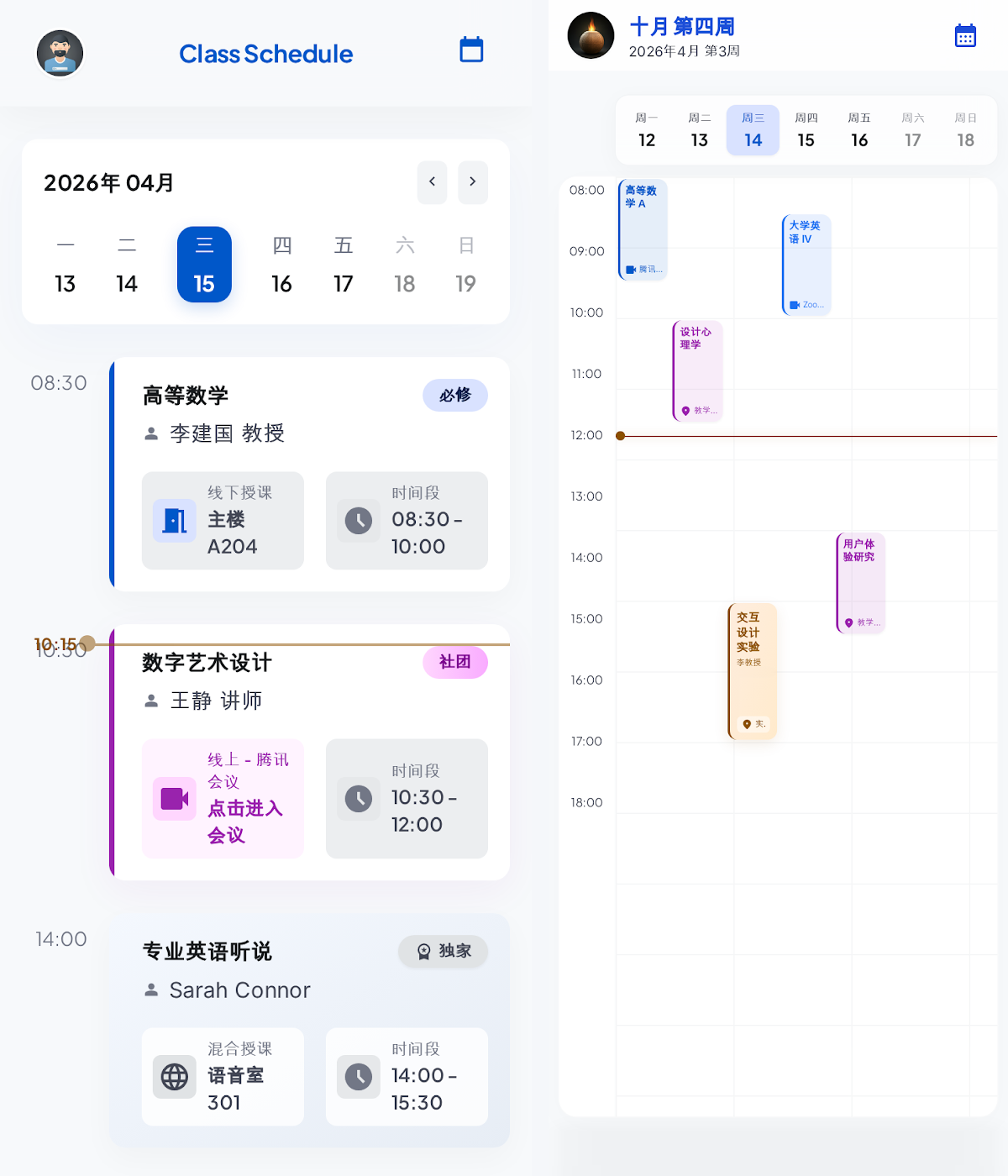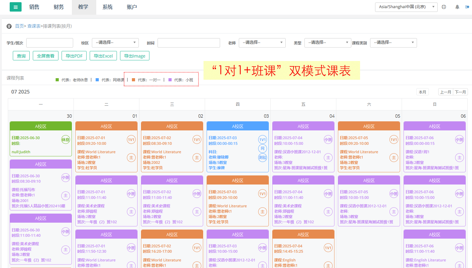 (3)优化课表设计,支持双语言展示与国际时间适配,兼顾不同地区的使用需求,方便相关人员查看课表、安排教学相关事宜,提升使用体验。