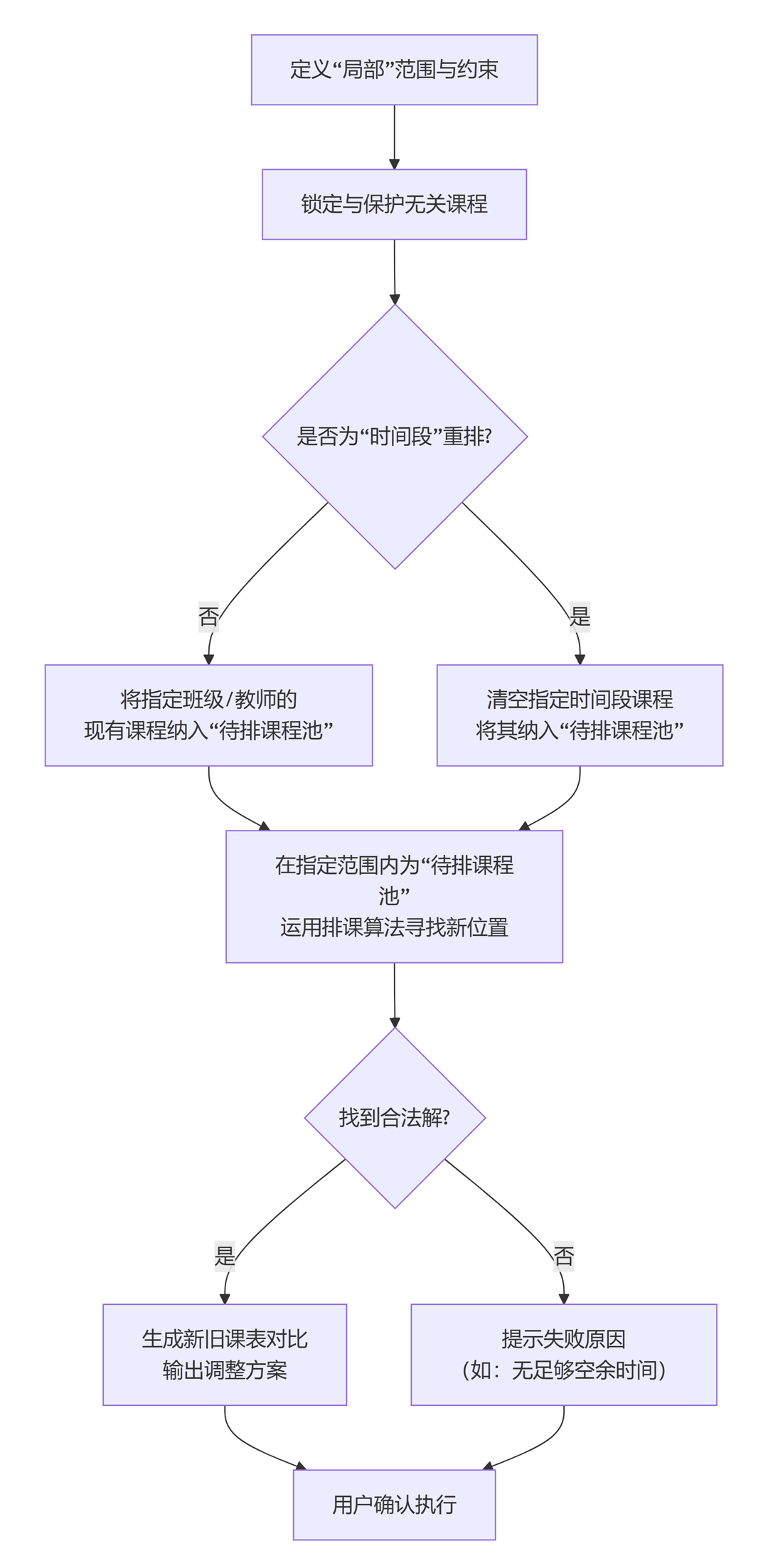 - 精准可控:最小化调整影响范围,确保非相关班级/教师课表零扰动。