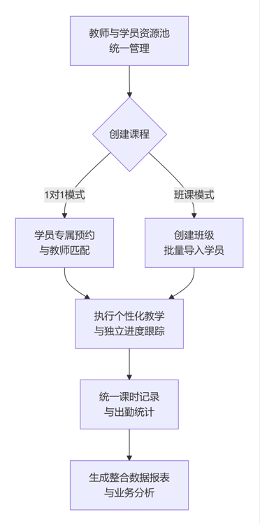 3、统一管理核心 “双模式”并非简单叠加,而是深度融合。所有教师资源、学员数据、财务信息均在单一平台集中处理。管理者可以统一调配师资,跨模式查看学员完整学习历程,并生成整合的业务报表。这解决了因系统割裂造成的数据孤岛与管理冗余问题,实现了资源、数据与流程的真正统一。